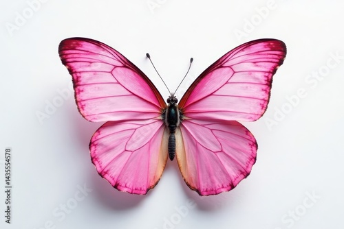 Fototapeta premium Delicate pink butterfly, wings spread, pristine white backdrop, beautiful,...