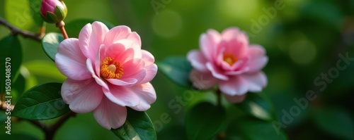 © Rainyphoto, Obraz premium Delicate pink camellia, vibrant green foliage , plants, pink