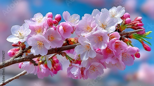 © misster, Obraz premium Delicate Pink Cherry Blossom Branch in Full Bloom Against a Soft Blue Sky Background
