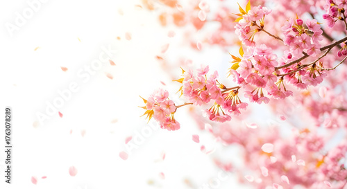 Fototapeta premium Delicate pink cherry blossom branch in full bloom with soft petals gently falling against a bright white background, creating a beautiful spring banner
