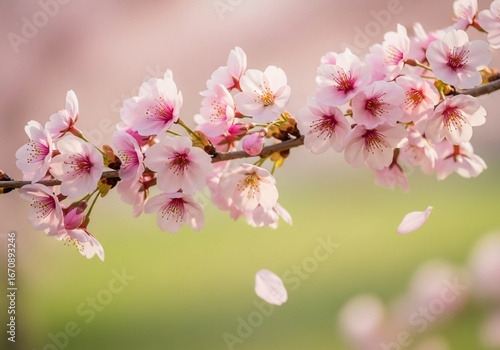 © Stwn, Fototapeta premium Delicate pink cherry blossom branch with falling petals springtime nature