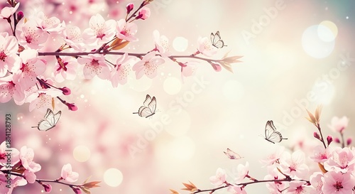 Obraz premium Delicate Pink Cherry Blossoms and Butterflies Springtime Floral Background Art