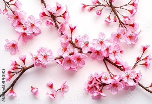 © Thiti, Obraz premium Delicate pink cherry blossoms arranged in a graceful, flowing pattern against a clean, white background, pretty, pink