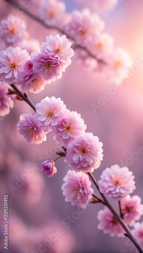 © Al, Obraz premium Delicate pink cherry blossoms bloom on a branch with soft focus and warm sunlight creating a dreamy spring atmosphere