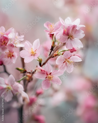 Obraz premium Delicate pink cherry blossoms blooming on a branch with soft focus background...