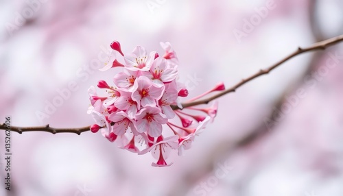 © Sanook, Obraz premium Delicate pink cherry blossoms cluster on a slender, gently curving branch against a blurred background, flora, spring