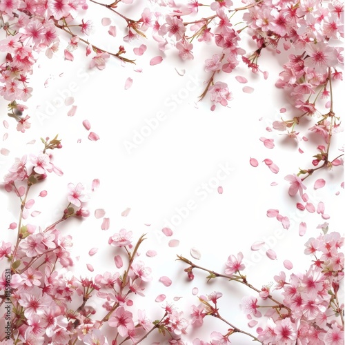 © kamonrat, Naklejka premium Delicate pink cherry blossoms dance across a white background, creating a dreamy and romantic frame with a touch of Japanese inspiration.