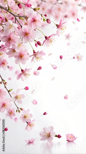 Fototapeta premium Delicate Pink Cherry Blossoms Falling Against a White Background. Generative AI
