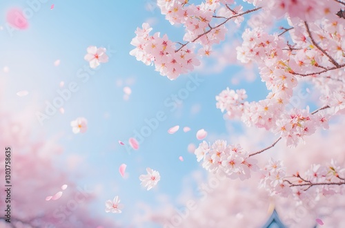 © paper later, Fototapeta premium Delicate Pink Cherry Blossoms Falling Gently Against a Blue Sky