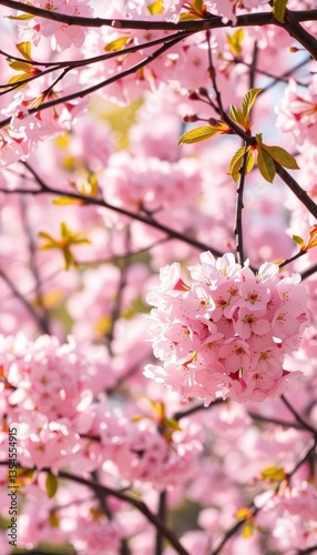 Obraz premium Delicate pink cherry blossoms frame a blooming pink tree, soft spring light,...