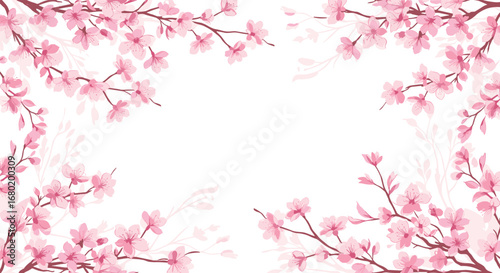 Fototapeta premium Delicate pink cherry blossoms frame a serene white space, evoking spring's...