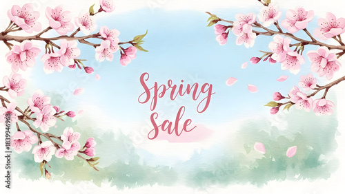 Fototapeta premium Delicate pink cherry blossoms frame a soft focus spring greeting card design