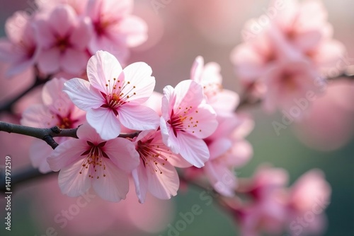 Fototapeta premium Delicate pink cherry blossoms, full bloom, soft focus, pattern, petals,...
