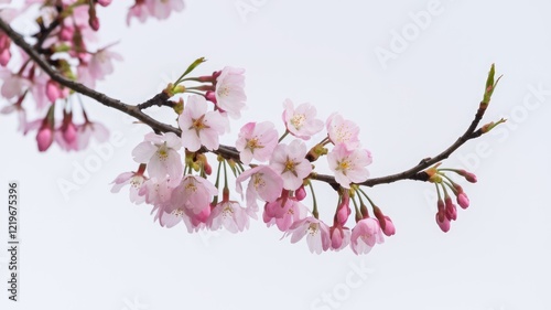 © Vibudhaart, Obraz premium Delicate pink cherry blossoms in full bloom on a branch against a soft white background.
