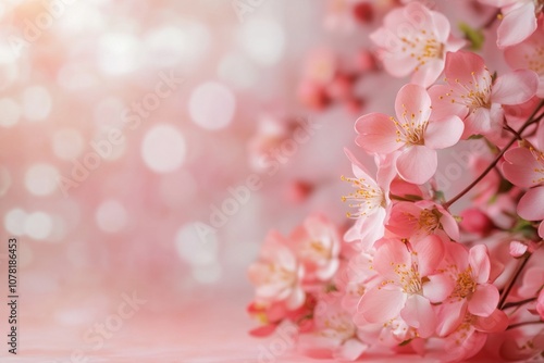 Fototapeta premium Delicate pink cherry blossoms on a blurred pink and white background.