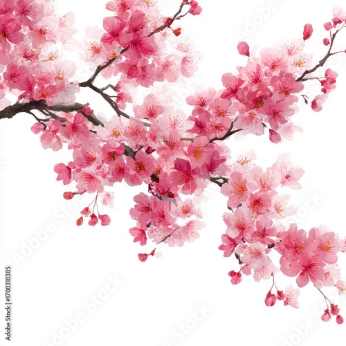 © Adri, Naklejka premium Delicate pink cherry blossoms on a branch against a white background. Soft watercolor style