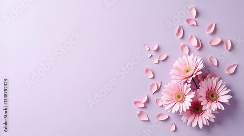 Naklejka premium Delicate pink chrysanthemums, Scattered petals, Soft lavender background