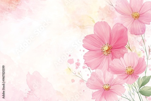 Fototapeta premium Delicate pink cosmos flowers on a soft watercolor background.