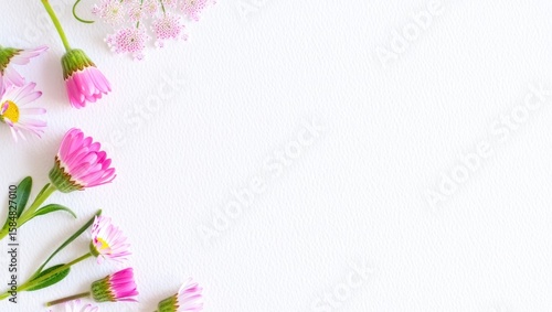 © Tasnim, Fototapeta premium Delicate pink daisies and tiny purple flowers arranged on a white textured background creating a soft floral border for copy space