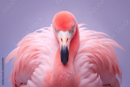 Obraz premium Delicate pink flamingo surrounded by light pastel pink feathers. Creative wallpaper with pink flamingo.