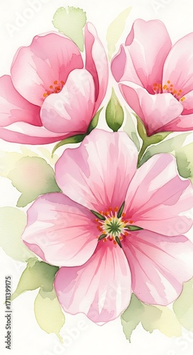 © rian, Naklejka premium Delicate Pink Floral Watercolor Painting.
