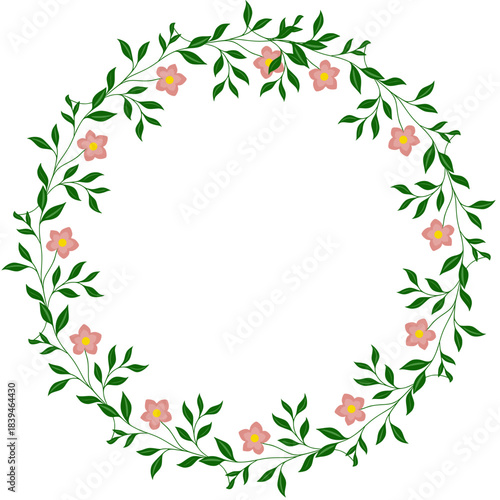 © Khrystyna Turchyn, Naklejka premium Delicate pink floral wreath vector frame with green leaves on white background
