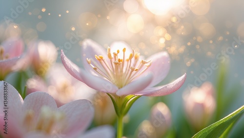 Fototapeta premium Delicate pink flower blossoms bathed in sunlight, bokeh background