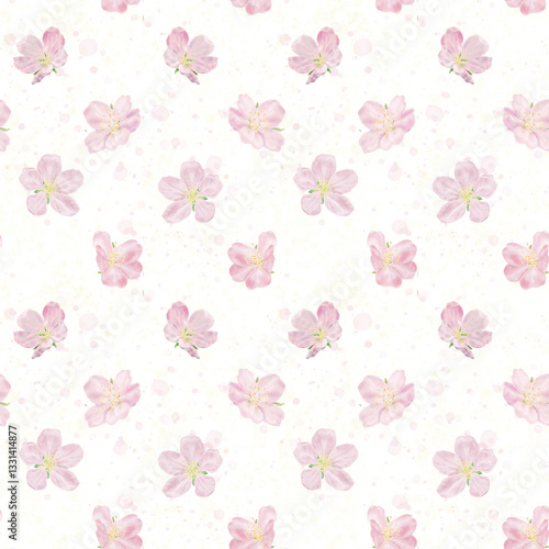 © Elena, Obraz premium Delicate pink flower, white petals and yellow stamens, seamless pattern. Watercolor digital illustration. Japanese sakura and branches of blossoming cherry and apple tree isolated on white background.