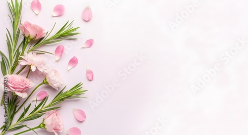 © MdNazir, Naklejka premium Delicate pink flowers and greenery border with scattered petals on white background