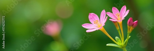 © Withun, Naklejka premium delicate pink flowers bloom on a yellow stem with green foliage and tightly closed bud, green, buds