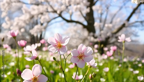 Obraz premium Delicate Pink Flowers Bloom Underneath Cherry Blossoms