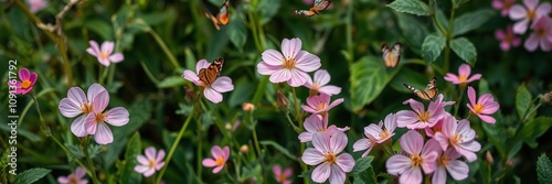 Fototapeta premium Delicate pink flowers blooming in a lush green meadow with butterflies...