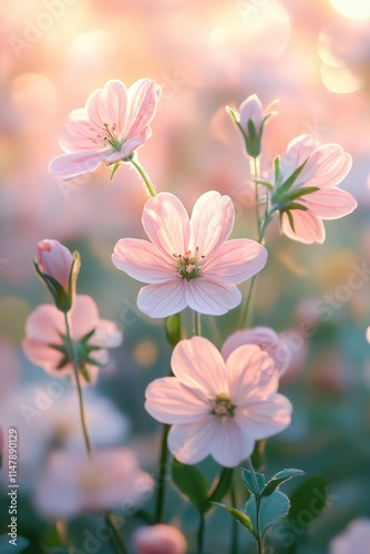 Fototapeta premium Delicate pink flowers blooming in soft sunlight