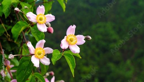 Fototapeta premium Delicate pink flowers in a lush green setting