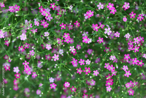 © sakhorn38, Fototapeta premium Delicate Pink Flowers in Bloom Against a Lush Green Background