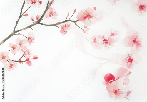Fototapeta premium Delicate Pink Flowers On Branch Watercolor Style White Background