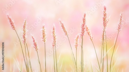 © Alfath, Fototapeta premium Delicate pink grass stems against a soft, blurred pastel background.