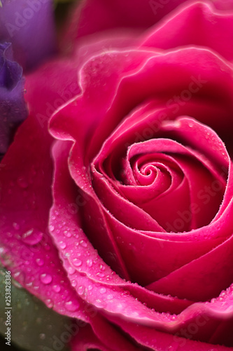 Obraz premium delicate pink in dew drops rose close up on a blurry background with...