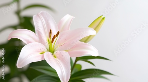 © ainun, Naklejka premium Delicate pink lily blossom with a closed bud. Green leaves and white background
