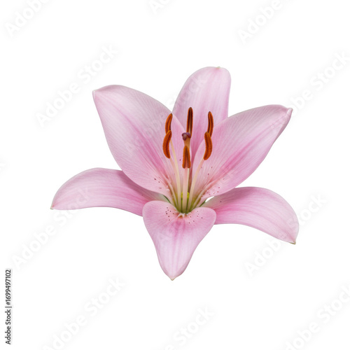 © Photo, Fototapeta premium Delicate pink lily blossom with intricate stamens isolated on white background