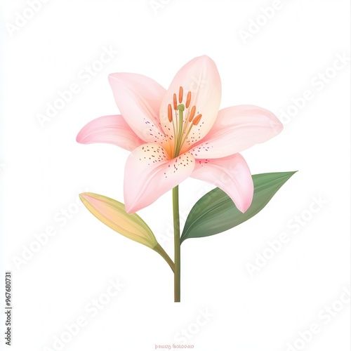 Naklejka premium Delicate pink lily flower illustration with soft petals and green leaves, perfect for floral designs and botanical art.