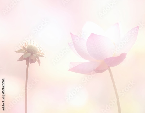 Naklejka premium Delicate Pink Lotus Blossom and Bud Against Soft Pastel Background
