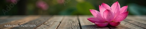© Nipon, Fototapeta premium Delicate pink lotus flower on wooden table background with subtle texture, elegance, wood