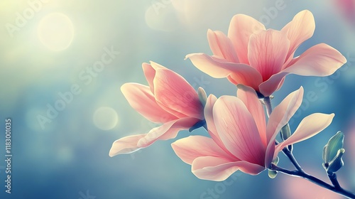 Fototapeta premium Delicate Pink Magnolia Blossoms Against Soft Blue Sky