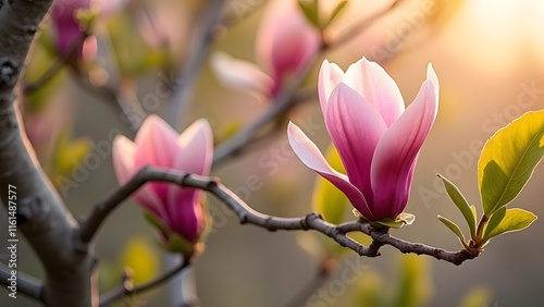 Fototapeta premium Delicate Pink Magnolia Blossoms, Spring Flowers on Curved Branch with Soft Morning Light
