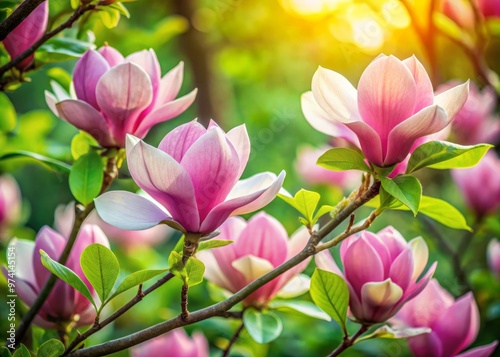 © Arnada, Fototapeta premium Delicate pink magnolia flowers bloom on a lush green bush, surrounded by large leaves, against a soft, blurred