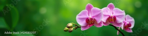 Fototapeta premium Delicate pink orchids in bloom on a lush green background, flower arranging,...