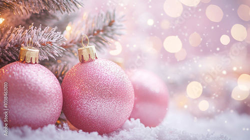 Obraz premium Delicate pink ornaments adorn a sparkling Christmas tree on a snowy Christmas...