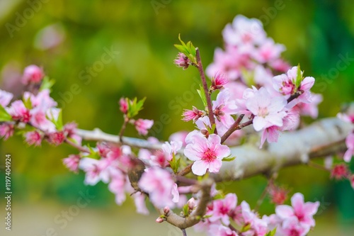 © NguyenNgoc, Obraz premium Delicate pink peach blossoms blooming in spring sunlight against a soft green background