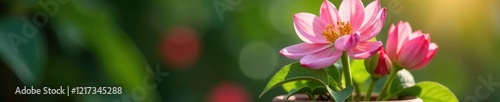 Naklejka premium Delicate pink petals unfolding in a terracotta pot, greenery, colorful, spring